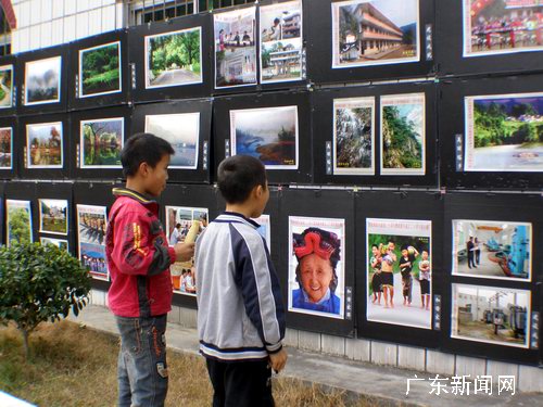 12月14日,瑶族学生邓威(左)与同伴在观看深渡水瑶族乡成立二十周年图片展览。