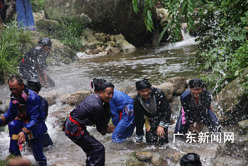 来到河边,师公再次念经诵福,随后神像被抬入河中,瑶民用随身携带的手帕,擦洗神像。净身完毕,神像被抬放回岸边。随即,岸边站立的瑶民一声欢呼,纷纷跳入河中,相互将给神像净过身的圣水泼向对方,水花飞溅,淙淙山溪顿时成了一个欢乐的海洋。瑶民说,沾点圣水可保身体健康,平安幸福。