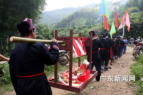 再往里走,隐约听到了牛角的号响和敲打铜锣的声音。只见数十名瑶胞手持彩旗、吹着牛号角、敲着铜锣浩浩荡荡往半山腰的神庙走去。村民告诉记者,这是接神到河边洗浴。